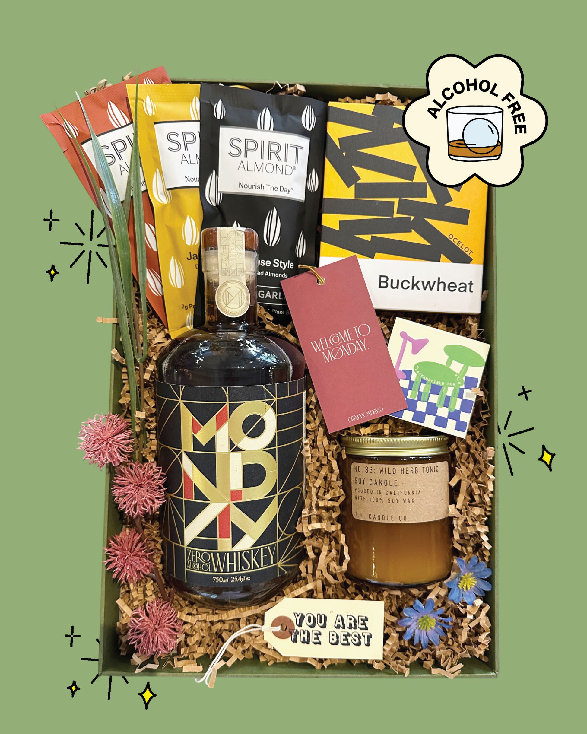 This set is more than just a gift—it's an invitation to slow down and savor the moment. From the artisanal craftsmanship of Monday Alcohol-Free Whiskey to the thoughtful details like the P.F. Candle and premium snacks, every element has been chosen to create an experience of indulgence, warmth, and connection. All without any hangovers or guilt.