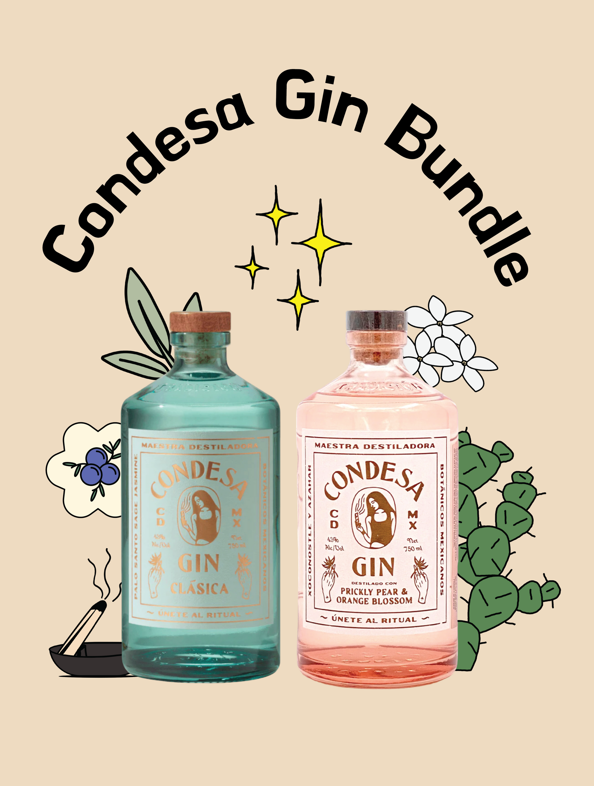 Can't decide which of our two bestselling gins to get? Why not get both?! This two-bottle gift bundle is the perfect gift for the gin lover in your life. Condesa Gin Prickly Pear & Orange Blossom is bright and floral while Condesa Gin Clásica (with palo santo, sage and jasmine botanicals!) is more earthy and savory. Together, you get the best of both worlds! Make a delicious gin and tonic, Negroni or martini. Distilled by a female distiller in Mexico City, these gins are a stunning representation of Mexico City Extra Dry Gin.
