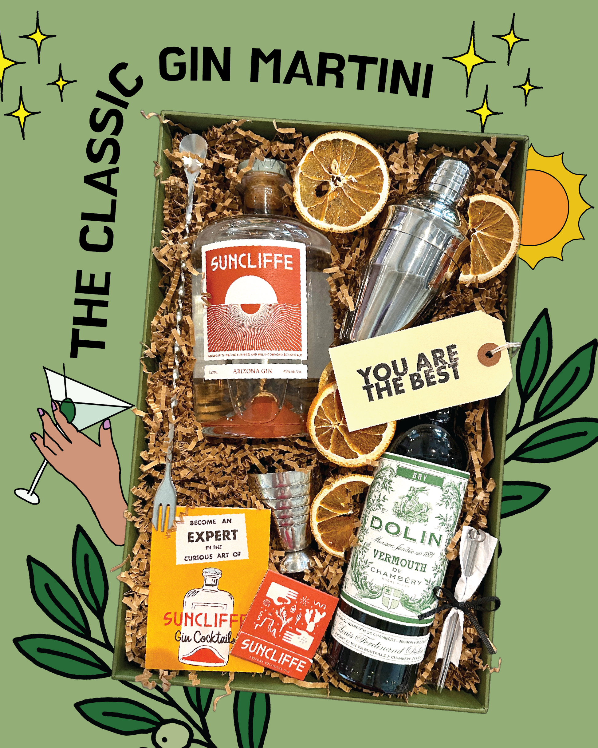 Included: Full-sized bottle of craft, small-batch Suncliffe Gin (750mL), 2 cocktail picks (can be used for martini garnishes OR for tray pass appetizers!), Dolin Dry Vermouth 375mL (we love Dolin Dry - it's a classic!), California organic dried orange crisps (perfect for cocktail garnish or a healthy snack!), 8oz stainless steel shaker (perfect for 1 or 2 martinis at a time!) + stainless steel multi-unit jigger, stainless steel cocktail barspoon.