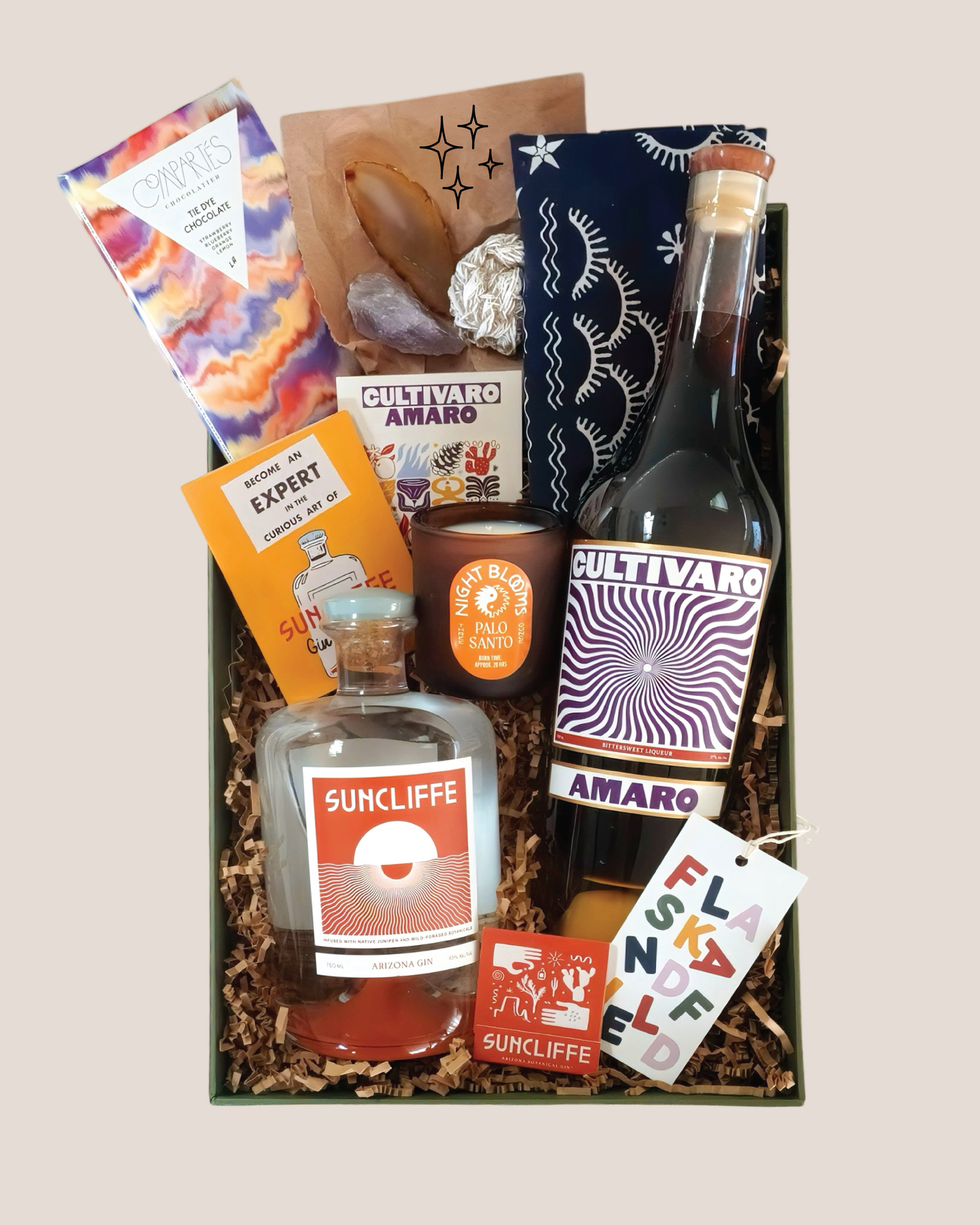 Included: Suncliffe Gin (750mL), Suncliffe Cultivaro Amaro (750mL), printed Suncliffe product cards and matchbook, Night Blooms scented candle 3oz, Abracadana Bandana, artisanal chocolate bar, 3 natural crystal rocks, all presented in our eco-friendly signature gift box with lid, along with your personalized gift note!