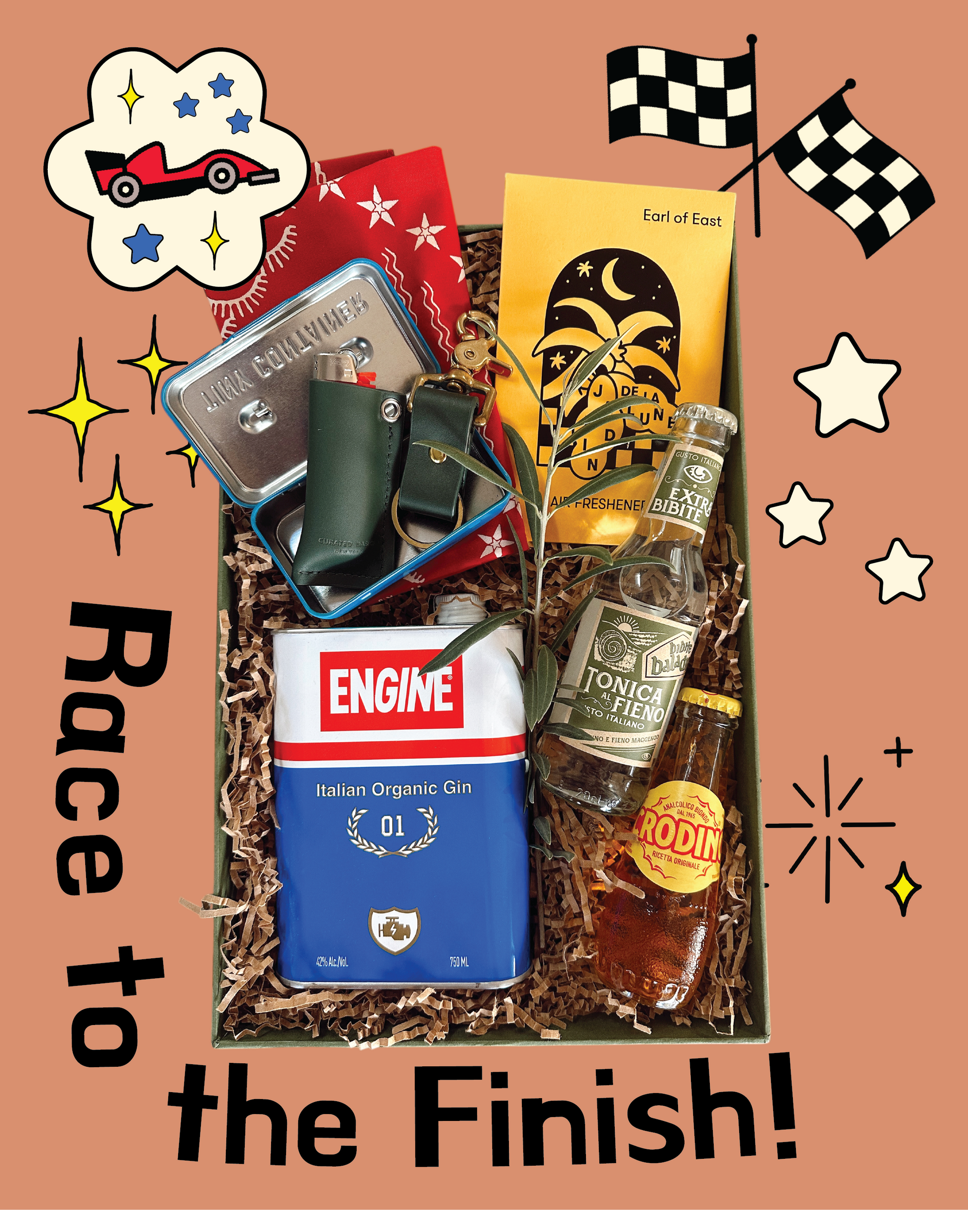 Included: Engine Gin (750mL), tonic water, Crodino N/A ready-to-drink aperitivo, racing bandana, tiny metal Hightide container, leather lighter holder, lighter, leather belt clip, and Earl of East air freshener, all presented in our eco-friendly signature gift box with lid, along with your personalized gift note!