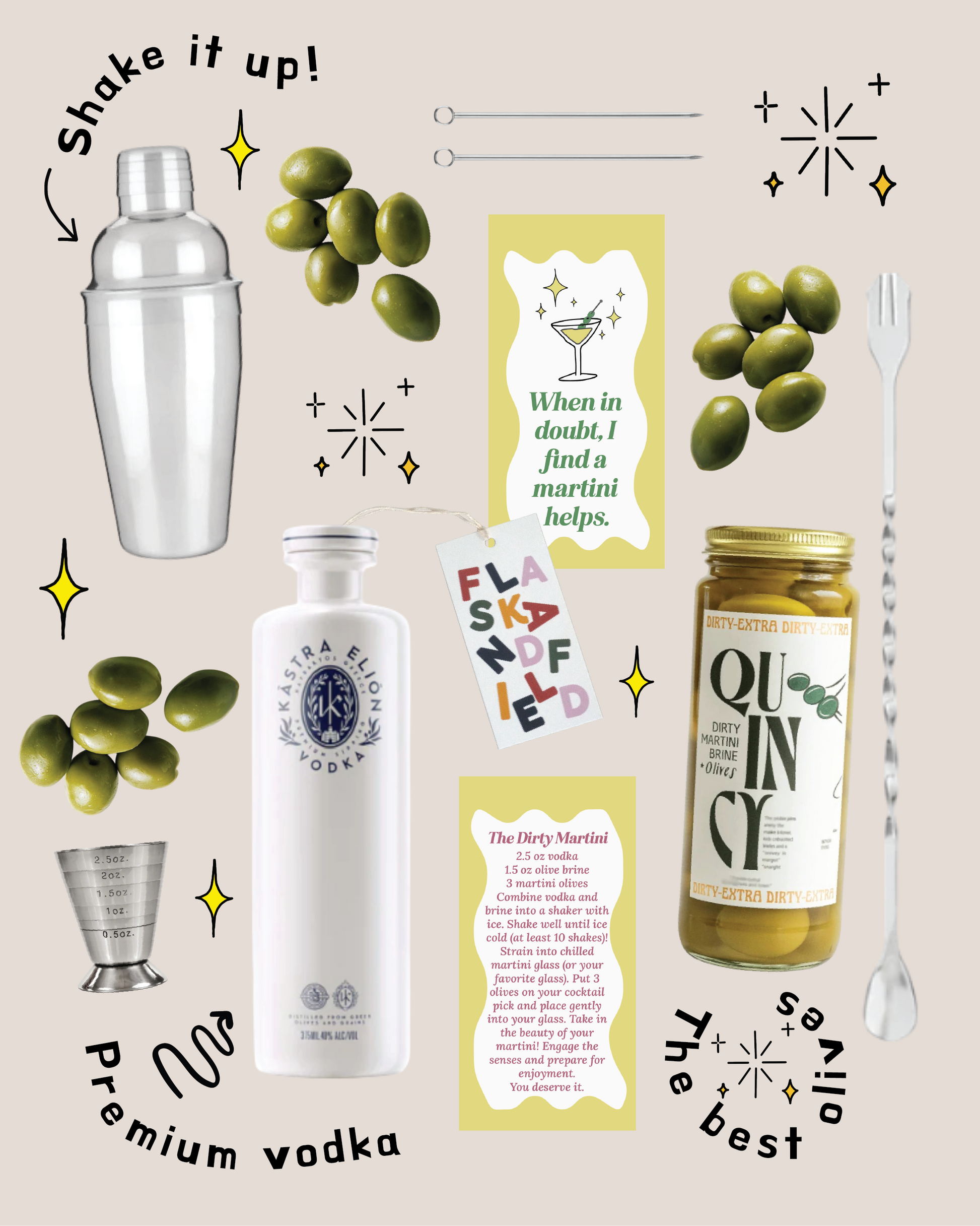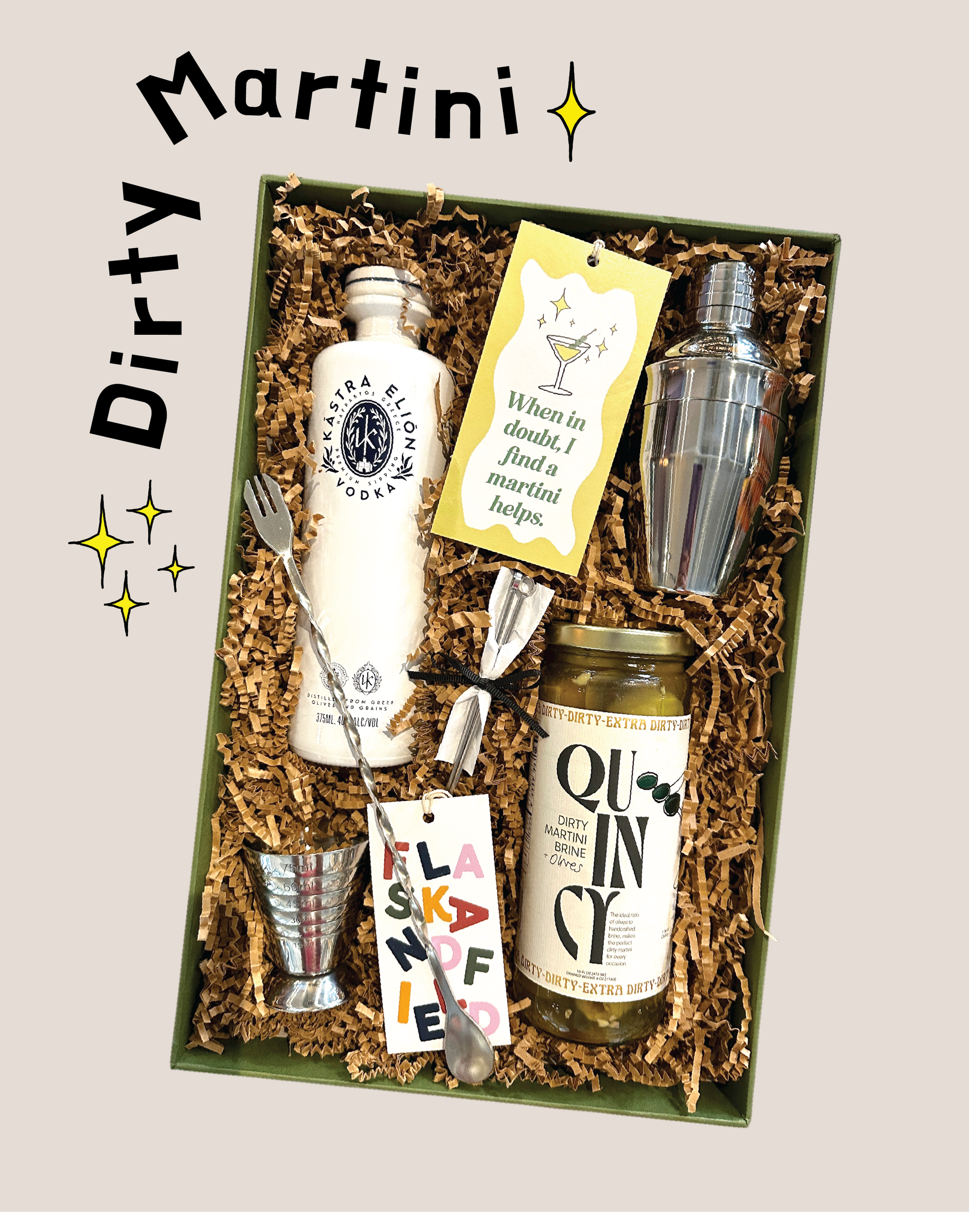 Calling all salt lovers! Our new and improved Dirty Martini set is for you! Our bestseller year after year, the Dirty Martini is here to stay! The ultimate party in a box for the true Dirty Martini aficionado. Crafted with premium Greek sipping vodka and Quincy olives in salty brine, to create the smoothest Dirty Martini in town. This set includes everything needed to stir, shake, and sip the perfect Dirty Martini, right out of the box. It's practically dinner. Each set arrives with a printed F&F recipe hang tag and is thoughtfully presented in our eco-friendly, recyclable, reusable premium gift box with lid, along with your personalized gift note. A gift to remember for best friends and business friends alike. Everyone loves a Dirty Martini!