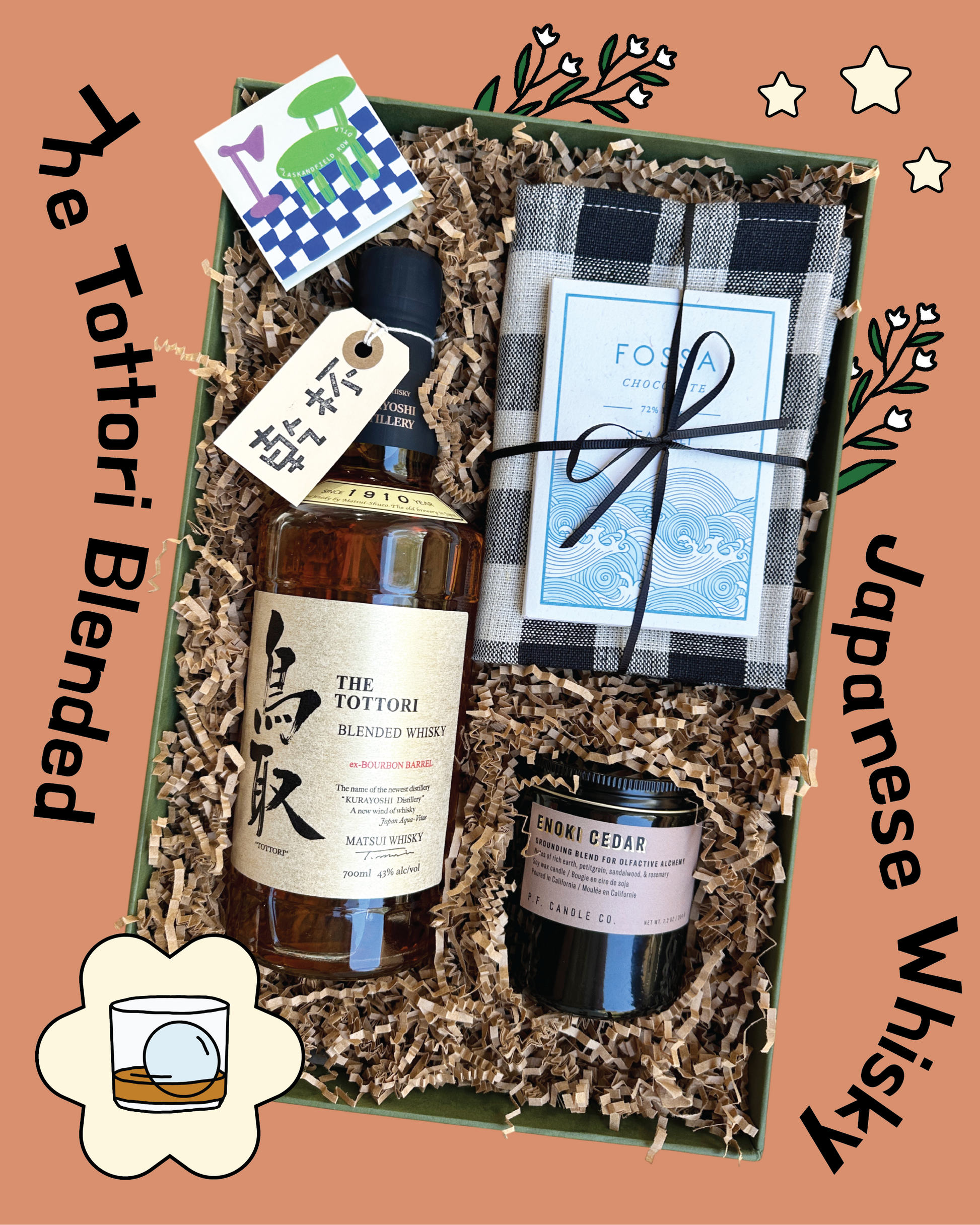 What's included: The Tottori Japanese Whisky in gift box, Japanese bar cloth, PF Candle incense, artisanal chocolate, F&F matchbook, all presented in our signature, premium gift box with lid along with your gift note!