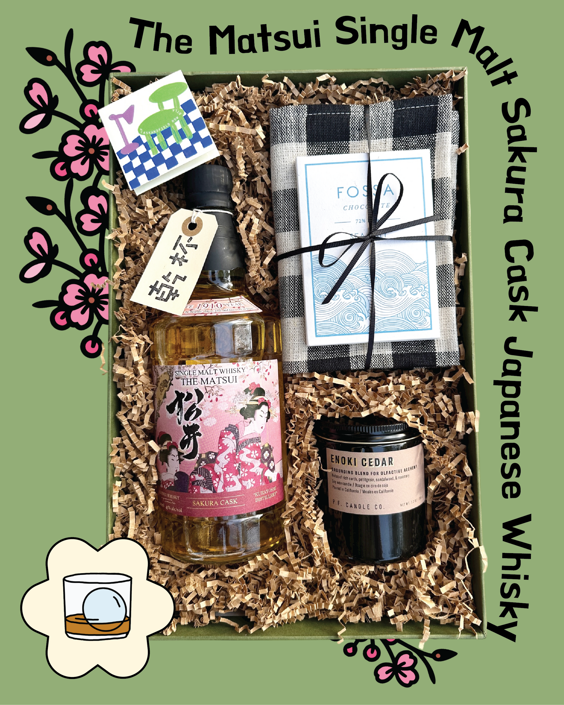 What's included: The Matsui Single Malt Sakura Cask Japanese Whisky in gift box, Japanese bar cloth, PF Candle incense, artisanal chocolate, F&F matchbook, all presented in our signature, premium gift box with lid along with your gift note!