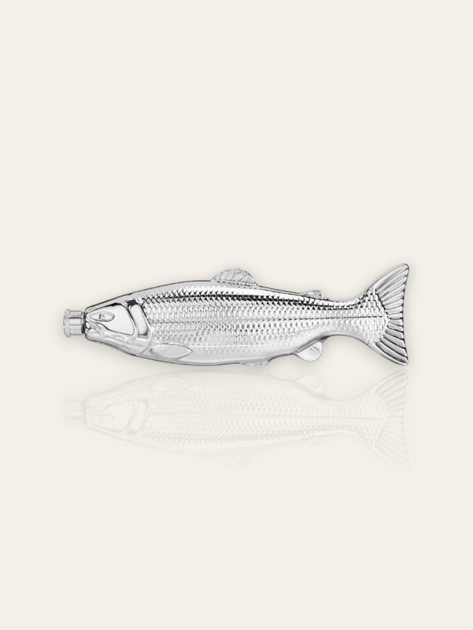 Cast in shimmering stainless steel, our true-to-life trout flask is perfect for anyone who can drink like a fish. Tucking covertly into a backpack or fishing vest pocket, it holds four ounces of any elixir. Really, what better way to get sloshed?